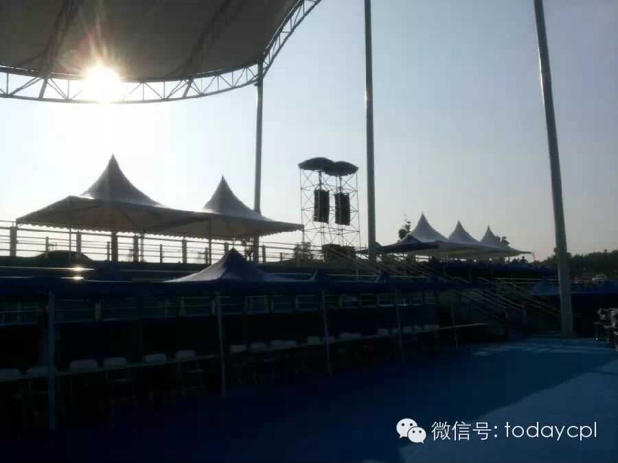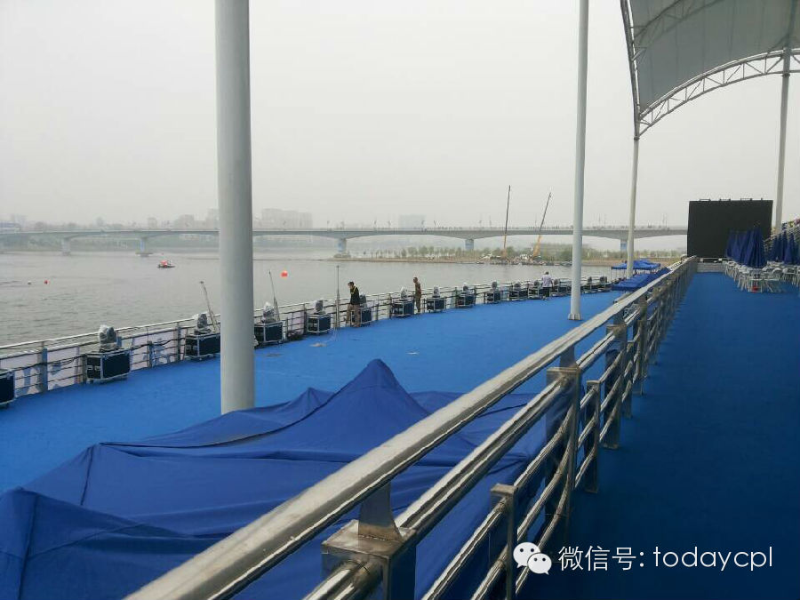 联赛综合布展负责人姚智:位于太极广场的运动员围场区的建设工作现在我们已经基本上完成,较去年比较,今年我们为了在酷热的气候下面保障我们运动员能够顺利的完成比赛,所以我们对这个梯形码头又重新进行了改造升级,现在我们把这个你现在看到的梯形码头一直延伸到大桥底下,目的就是为了能够利用大桥底下自然风和阴凉,这样就是避免运动员出现一些中暑呀,或者因为高温导致影响比赛成绩的情况发生。 作为此次比赛的主观赛区,位于沧浪洲湿地公园2号码头的沧浪之帆的建设也是此次赛事筹备的一项重要工作。通过前期消防人员对该区域进行冲洗后,又相继对看台进行除尘铺设地毯,并在部分区域架设帐篷、摆放桌椅。